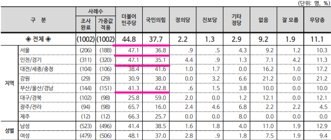 ▲서울( 민주 43.4%, 국힘 36.3%) ▲ 경기·인천(민주 48.2%, 국힘 33.8%), ▲ 대전·세종·충청(민주 41.5%, 국힘 41.1%), ▲ 광주·전라(민주 60.0%, 국힘 21.7%), ▲ 강원·제주(민주 46.4%, 국힘 35.5%) ▲ 대구·경북(국힘 46.1%, 민주 37.5%) ▲ 부산·울산·경남(국힘 46.8%, 민주 37.3%)
