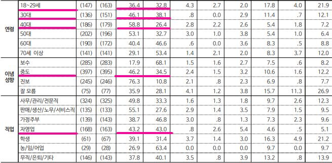 2) 연령별 : △20대 이하 30.7% vs 43.1% △30대 32.0% vs 41.6% △40대 22.6% vs 56.1% △50대 32.1% vs 51.8% △60대 이상 44.8% vs 37.1%