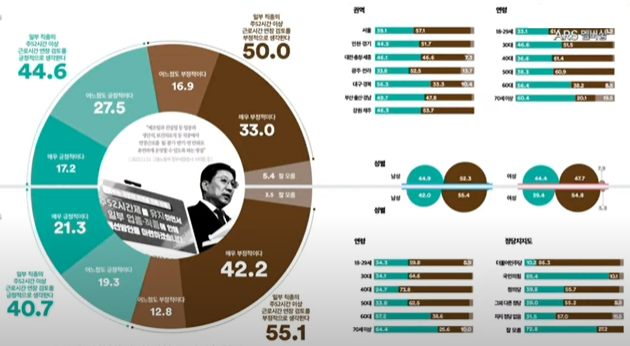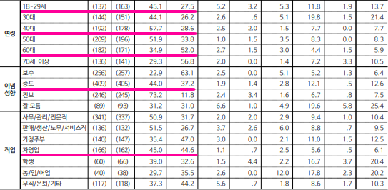 1) 연령별 : 20대( 긍정 21.7% 대 부정 71.6% ), 30대( 긍정 22.5% 대 부정 72.4% ), 40대( 긍정 15.6% 대 부정 83.5% ), 50대( 긍정35.3% 대 부정 59.4% ), 60대 이상( 긍정 47.9% 대 부정 48.5% )
