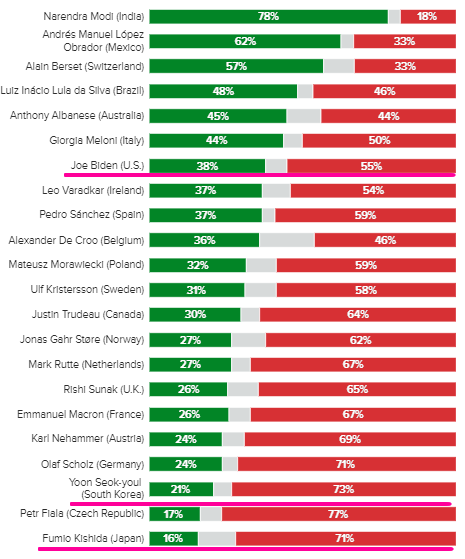 **조 바이든 긍정평가 38% 부정 평가 55%(7위) , 기시다 긍정평가 16% 부정 평가 71%(22위)