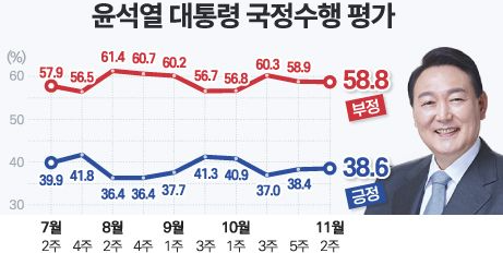 1. 윤대통령 지지율 : 긍정 38.6%(2.5% 상승), 부정 60.2%(2.4% 하락)