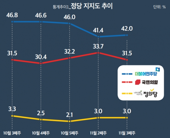 (11월 17일~18일, 만 18세 이상, 전국 성인남녀 1001명(ARS)/ 1010명(CATI), 표본오차 95% 신뢰 수준에 ±3.1%)