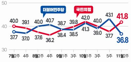 2. 정당지지도 : 민주당 40.0%(5.9%하락) , 국민의힘 40.5%(4.3%상승)