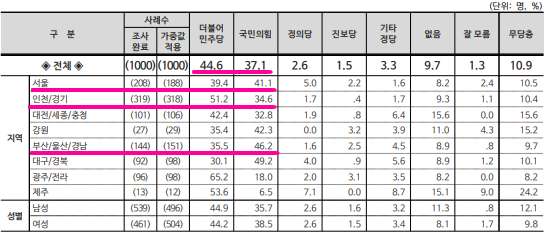 ▲서울( 민주 43.4%, 국힘 36.3%) ▲ 경기·인천(민주 48.2%, 국힘 33.8%), ▲ 대전·세종·충청(민주 41.5%, 국힘 41.1%), ▲ 광주·전라(민주 60.0%, 국힘 21.7%), ▲ 강원·제주(민주 46.4%, 국힘 35.5%) ▲ 대구·경북(국힘 46.1%, 민주 37.5%) ▲ 부산·울산·경남(국힘 46.8%, 민주 37.3%)