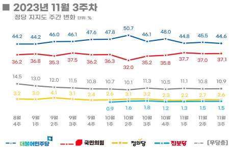 2023.11.27 - [정치] - <11월말 12월초 여론조사> 윤대통령 지지율 및 정당 지지율 등