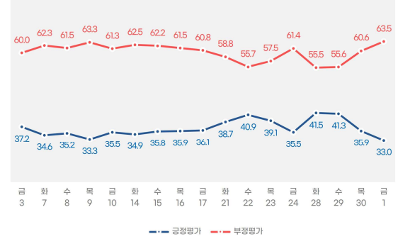 1. 윤대통령 국정평가 : 긍정평가 33%(4%하락), 부정평가 60%(3%상승)