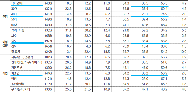 4) 이념 성향별 : ▲중도(민주 43.1%, 국힘 29.5%), ▲진보(민주 82.7%, 국힘 8.5%), ▲보수(국힘 75.5%, 민주 15.3%)