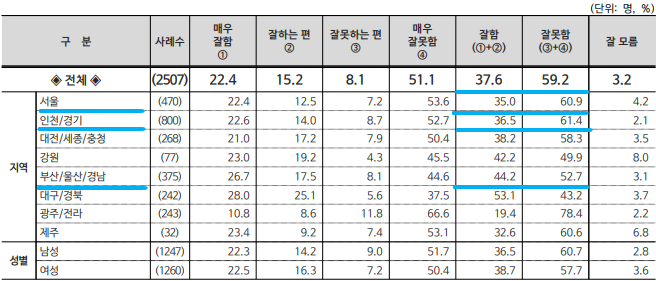 1) 지역별 : △서울 ‘찬 30.3%, 반 66.0%’ △경기·인천 ‘찬 32.7%, 반 62.6%’ △대전·세종·충청 ‘찬 39.4%, 반 56.2%’ △광주·전라 ‘찬 25.9%, 반 71.1%’ △대구·경북 ‘찬 35.2%, 반 58.5%’ △부산·울산·경남 ‘찬 33.4%, 반 59.0%’ △강원·제주 ‘찬 29.5%, 반 63.4%’