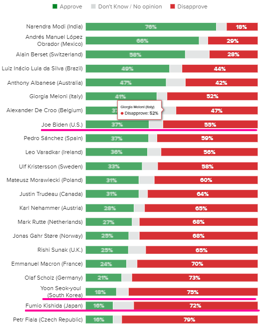 **조 바이든 긍정평가 37% 부정 평가 55%(8위) , 기시다 긍정평가 16% 부정 평가 72%(21위)