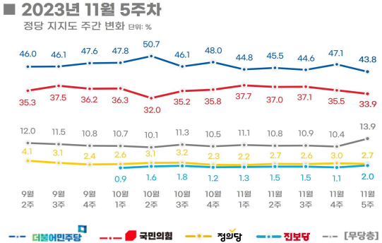 2023.12.11 - [정치] - <12월 2주 여론조사> 윤대통령 지지율 및 정당 지지율 등