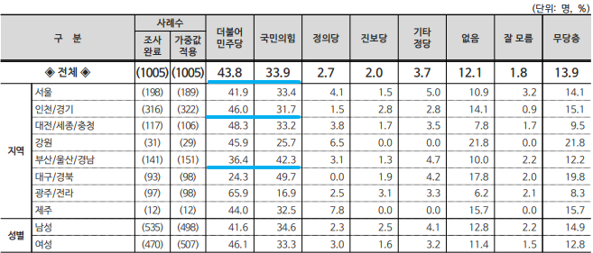 ▲서울( 민주 43.4%, 국힘 36.3%) ▲ 경기·인천(민주 48.2%, 국힘 33.8%), ▲ 대전·세종·충청(민주 41.5%, 국힘 41.1%), ▲ 광주·전라(민주 60.0%, 국힘 21.7%), ▲ 강원·제주(민주 46.4%, 국힘 35.5%) ▲ 대구·경북(국힘 46.1%, 민주 37.5%) ▲ 부산·울산·경남(국힘 46.8%, 민주 37.3%)