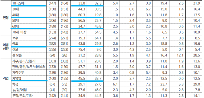 2) 연령대 : ▲20대( 민주 39.6%, 국힘 35.4%), ▲ 30대(민주 43.9%, 국힘 33.7%), ▲ 40대(민주 60.3%, 국힘 21.8%), ▲ 50대(민주 54.2%, 국힘 28.7%) ▲ 60세 이상(국힘 49.0%, 민주 38.3%)
