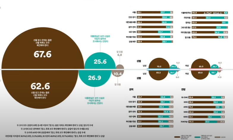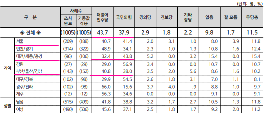1) 권역별 : △서울 '민주당' 34.6%, '국민의힘' 42.3% △인천·경기 '민주당' 42.6%, '국민의힘' 37.4% △대전·세종·충남북 '민주당' 34.6%, '국민의힘' 51.7% △광주·전남북 '민주당' 51.7%, '국민의힘' 17.0% △대구·경북 '민주당' 24.4%, '국민의힘' 60.1% △부산·울산·경남 '민주당' 38.1%, '국민의힘' 40.9% △강원·제주 '민주당' 44.3%, '국민의힘' 32.2%.