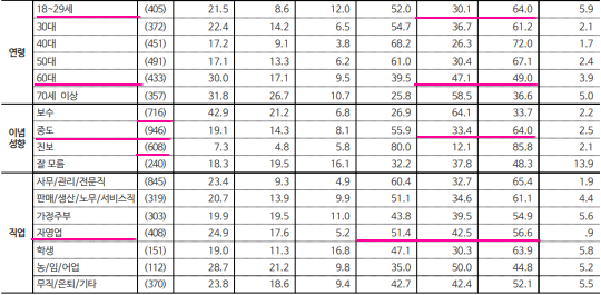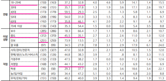 참고사항 : 보수 과표집 → 보수 285, 중도 372, 진보 251