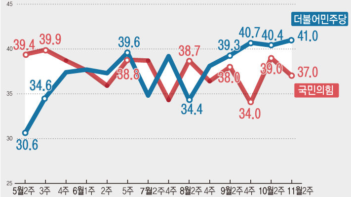 2. 정당지지도 : 국민의힘 37%(2% 하락), 민주 41%(0.6% 상승)