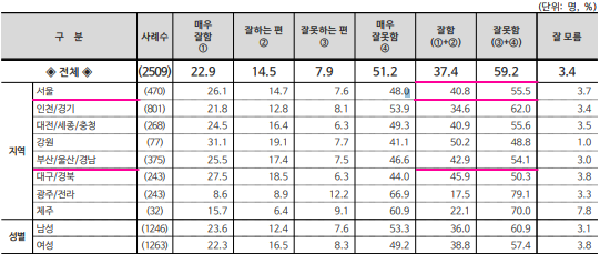 서울이 9.6% 오르며 가장 많이 올랐고 부산·울산·경남이 7.5% 오르며 뒤를 이었다. 반면 강원·제주는 12% 포인트 하락, 호남은 7.6% 하락, 대구·경북은 0.2% 하락