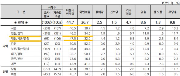 2. 정당지지도 : 더불어민주당 44.7%, 국민의힘 36.7%