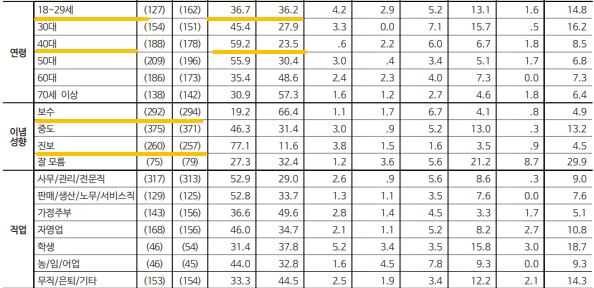참고사항 : 보수 과표집 → 보수 294, 중도 371, 진보 257