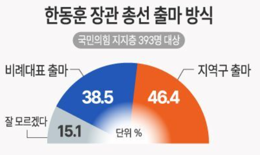 7. 한동훈 장관 총선 출마 방식? 지역구 출마 46.4%, 비례대표 출마 38.5%