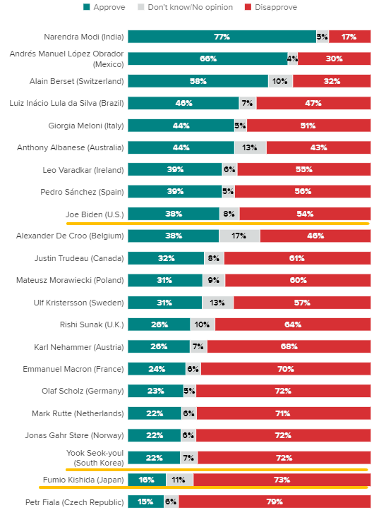 **조 바이든 긍정평가 38% 부정 평가 54%(9위) , 기시다 긍정평가 16% 부정 평가 73%(21위)