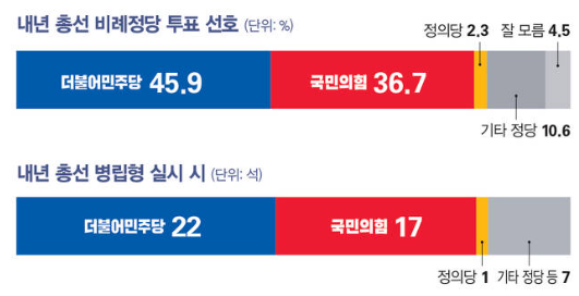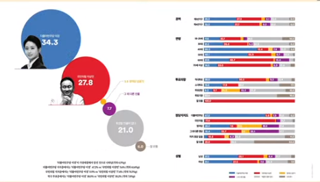 2) 준연동형(21대 총선방식) 으로 총선이 실시된다면 : 민주당은 8석, 국민의힘은 16석을 얻는 것으로 조사됐다. 정의당은 한 석도 얻지 못하지만, 기타 정당 등이 23석을 갖게 된다. 거대 양당이 24석으로 전체의 51%만 차지