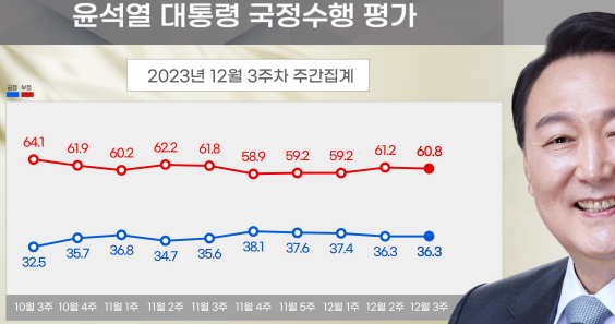 | <12월 3주 여론조사> 윤대통령 지지율 및 정당 지지율 등 (35) | 2023.12.18 |