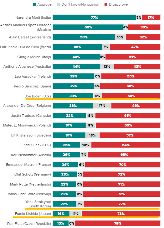 **조 바이든 긍정평가 38% 부정 평가 54%(9위) , 기시다 긍정평가 16% 부정 평가 73%(21위)