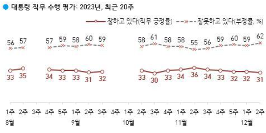 <12월 4주 여론조사 : 12월 22일~31일> 윤대통령 지지율 및 정당 지지율 등