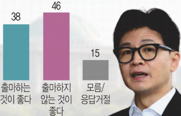 2. 한동훈 총선 출마 견해? 출마하지 않는 것이 좋다 46%, 출마하는 것이 좋다 38%