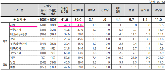 2. 정당지지도 : 더불어민주당 41.6%, 국민의힘 39.0%