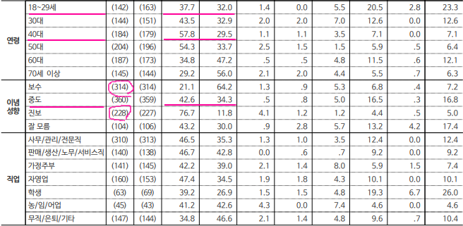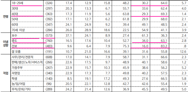 3) 이념성향별 : 중동층(민주당 37%, 국힘 26%)