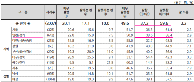 '잘못하는 편이다' 18%, '매우 잘못하고 있다' 38% →56%