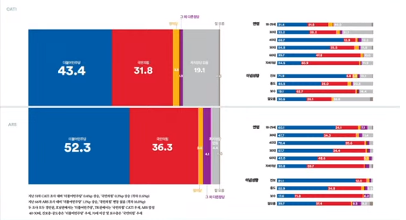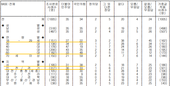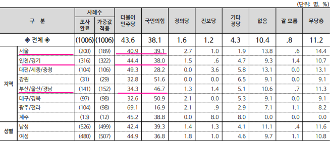 민주당을 택한 응답은 서울(46.9%), 경기/인천(51.6%), 부산/울산/경남(47.8%)에서도 우세한 편이었다. 대전/세종/충청(민주 44.5%-국힘 42.4%)에서는 양당을 택한 응답이 비등
