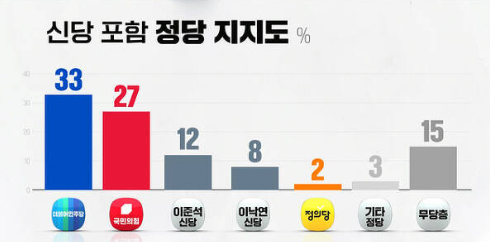 4. 신당포함 정당지지도? 민주당 33%, 국힘 27%, 이준석 신당 12%, 이낙연신당 8%, 정의당 2%