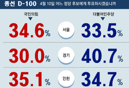 1.4·10 총선 여론조사? 민주당 33%, 국힘 33%, 무당층 24%