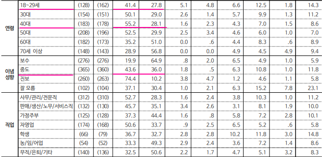 3) 이념성향별 : 중동층(민주당 37%, 국힘 26%)