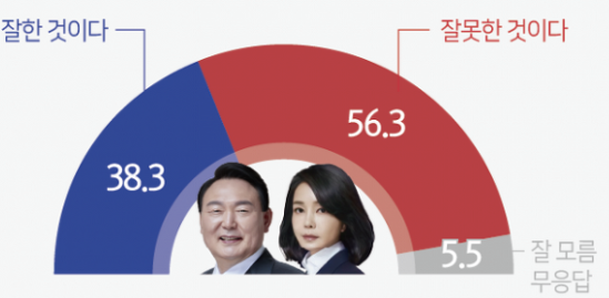 3. 김건희 여사, 50억 클럽 특검법 거부권 행사 동의 여부? 잘못한 것 56.3%, 잘한 것 38.3%