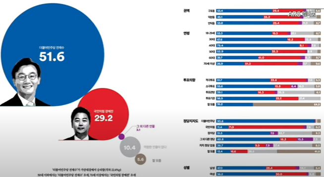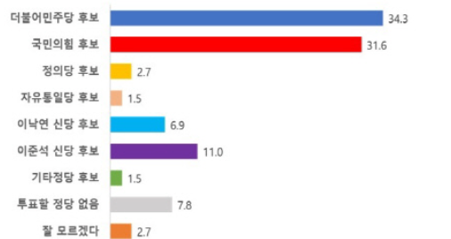 PK : 응답자 40%가 국힘을, 29%가 민주당을, 강원·제주에서는 40%가 민주당을, 29%가 국민의힘을 지지