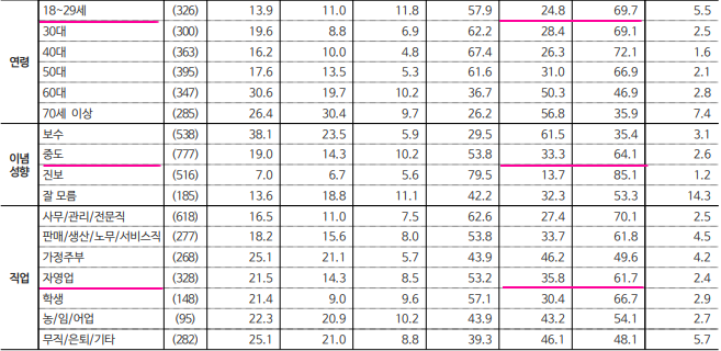 1) 연령별 : 20대 '정권 심판' 49.7% 대 '야당 심판' 38.3%, 30대 '정권 심판' 56.5% 대 '야당 심판' 32.7%, 40대 '정권 심판' 72.0% 대 '야당 심판' 24.8%, 50대 '정권 심판' 62.0% 대 '야당 심판' 31.8%, 70대 이상에선 '정권 심판' 32.4% 대 '야당 심판' 53.6%로 '야당 심판'이 더 높아..