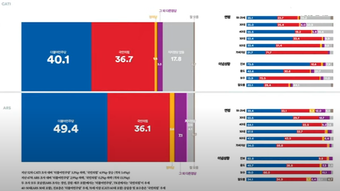 2. 정당지지율 : 민주당 49.4%, 국민의힘 36.1 %(ARS)