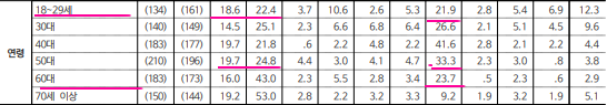 1) 연령대별 : 18-29세(한 20%, 이 18%), 30대(한동훈 23%·이재명 30%), 40대(한동훈 18%·이재명 50%), 50대(한동훈 34%·이재명 37%), 60대(한동훈 50%·이재명 24%), 70세 이상(한동훈 58%·이재명 17%)