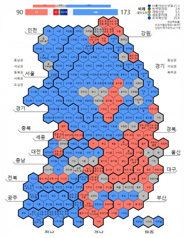 1. 전국 총선 정당별 득표수 예측 : 국민의힘 90명(지역 73+비례17), 민주당 173명(지역 146+비례 24(민주연합,조국혁신당)
