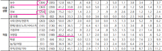 2) 지역별 : 조국혁신당은 호남권(조국혁신당 42.0% vs 국민의미래 19.4%), 충청권(조국혁신당 38.3% vs 국민의미래 27.5%)에서 높은 지지를 받았다. 반면 대구·경북(조국혁신당 18.4% vs 국민의미래 52.0%), 부산·울산·경남(조국혁신당 30.8% vs 국민의미래 39.2%), 서울(조국혁신당 29.8% vs 국민의미래 37.6%)에선 국민의미래에 열세를 보였다. 인천·경기에선 27.4%를 기록하며 국민의미래(29.8%)와 접전