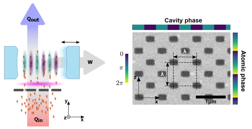 빛의 압력으로 거울은 엔진의 피스톤 역할을 하며 움직인다. 이렇게 만들어진 엔진의 온도는 최고 150,000˚C, 효율은 98%가 달성되었다. 이때 레이저를 통해 원자들의 양자 위상을 제어하여 원자들이 빛을 강하게 방출하는 현상을 빠르게 켜고 끌 수 있도록 하였다. 이런 방법으로 원자가 방출한 빛의 압력에 의해 가열, 팽창, 냉각, 수축 등에 따라 양자 엔진이 잘 동작하는 것을 관측하였다.