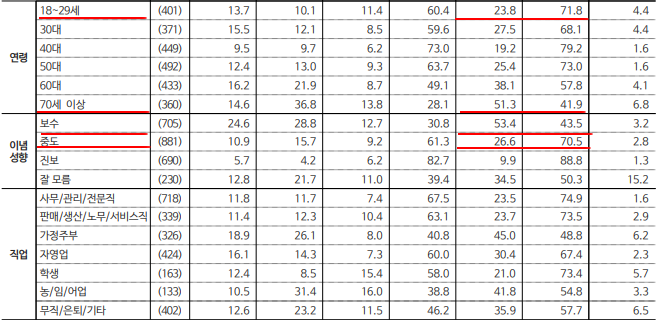 2) 연령별 : 70세 이상을 뺀 모든 연령층에서 부정평가가 긍정평가보다 많아.