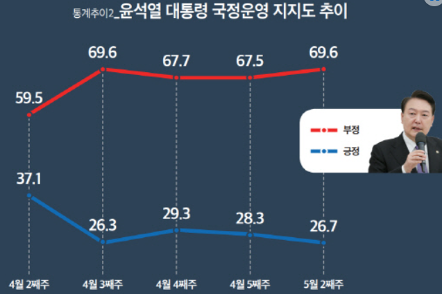 1. 윤석열 대통령 국정수행 평가? 긍정 26.7%, 부정 69.6%