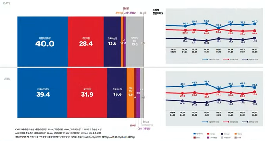2. 정당지지율 : 민주당 40.0%, 국민의힘 28.4%, 조국혁신당 13.6%(CATI)