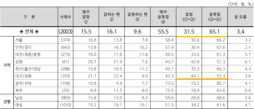 1. 윤석열 대통령 국정수행 평가? 매우 잘한다12.7%, 대체로 잘한다 16.7%, 대체로 잘못 14.8%, 매우 잘못 51.0%