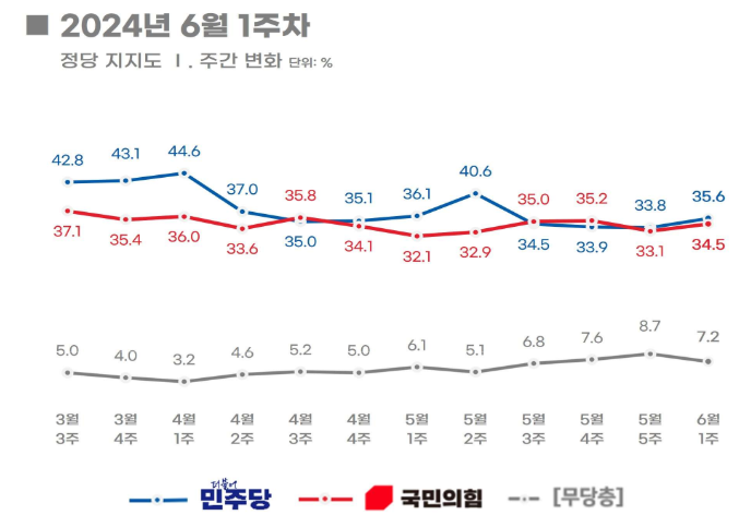 2. 정당지지도 : 더불어민주당35.6%, 국민의힘 34.5%, 조국혁신당 13.0%, 개혁신당 5.2%