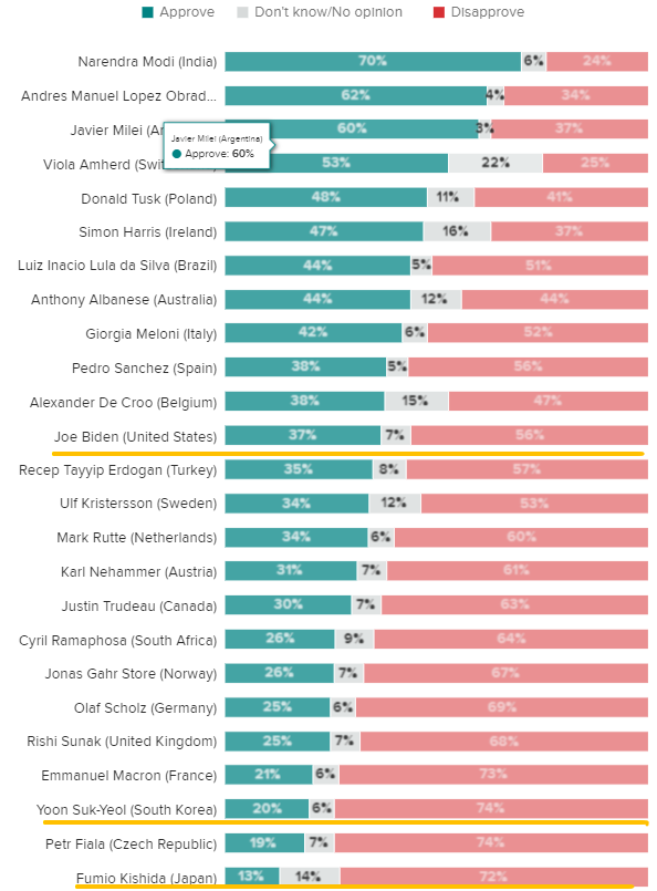 **조 바이든 긍정평가 37% 부정 평가 56%(12위) , 기시다 긍정평가 13% 부정 평가 72%(25위)